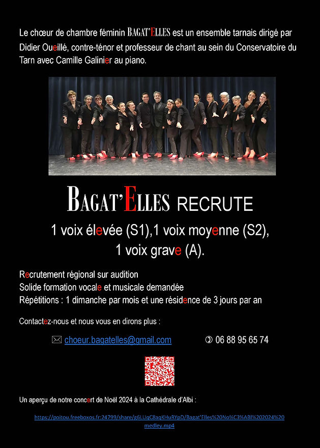 Le chœur de chambre Bagat’Elles est un ensemble composé de douze chanteuses, du pianiste Camille Galinier, et dirigé par Didier Oueillé, contre-ténor, professeur de chant au Conservatoire du Tarn et chef de chœur. Une passion commune pour le répertoire vocal polyphonique, qu’il s’agisse de pièces classiques, romantiques ou contemporaines, réunit ces musiciens autour d’un programme plein de poésie.
